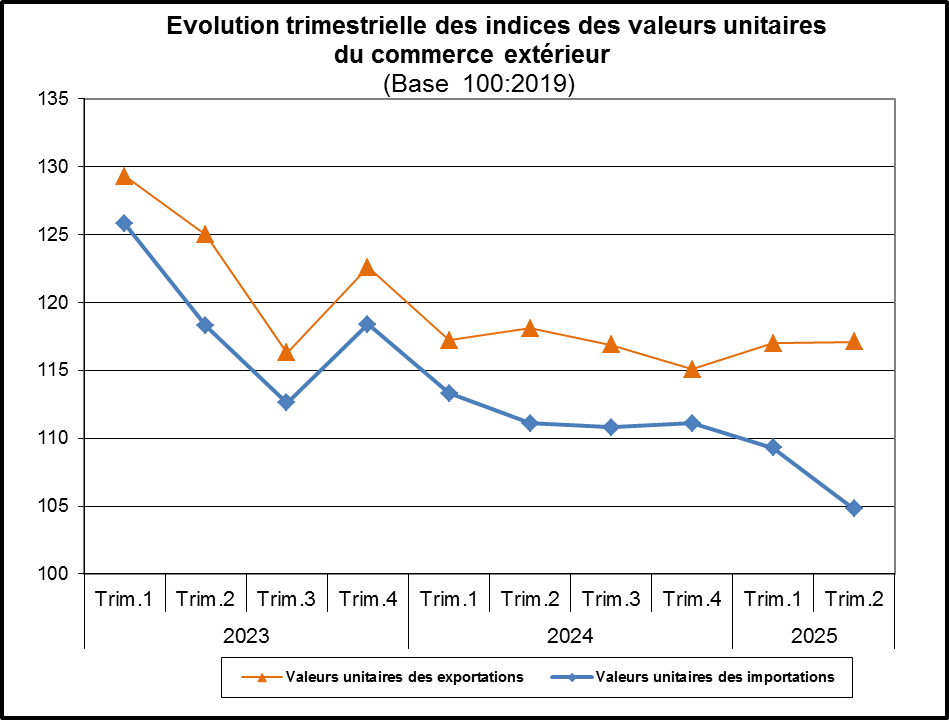 • T2 2025 : exportations 117,1 vs importations 104,8 → écart de +12,3 points
