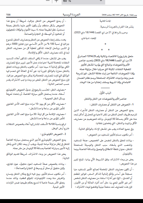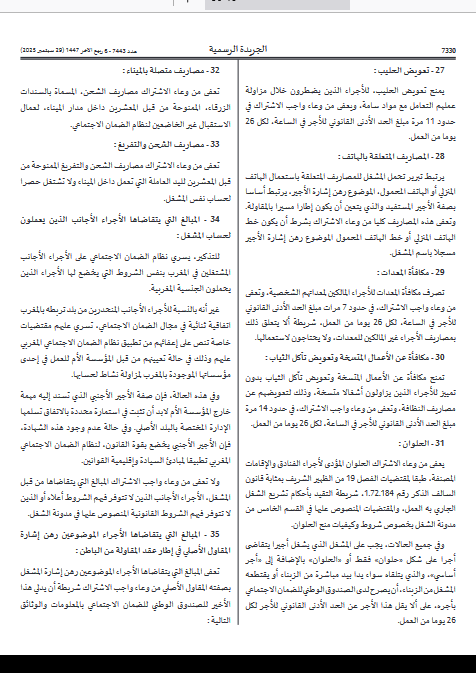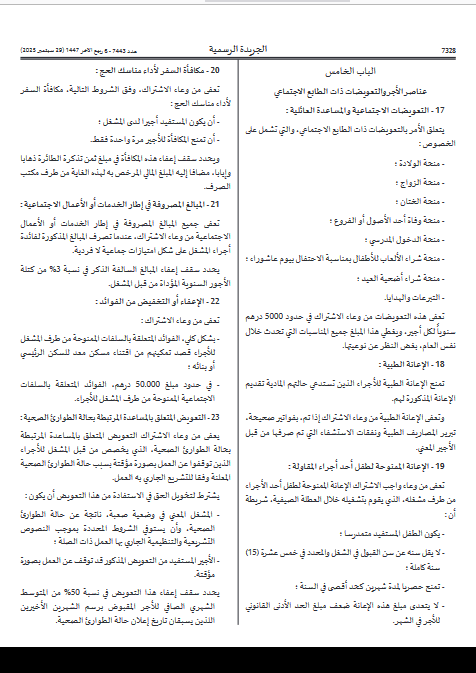 Publication au Bulletin officiel de l’arrêté de la ministre de l’Économie et des Finances n°25.1314, du 21 Dhou al-Qa‘da 1446 (19 mai 2025), fixant les éléments de salaire, les indemnités et les montants versés par l’employeur au salarié pour couvrir les dépenses justifiées engagées dans l’exercice de son travail, ainsi que les indemnités liées à la rupture du contrat de travail, non incluses dans l’assiette des cotisations dues au titre du régime de sécurité sociale, et précisant les conditions et le plafond de leur exonération de ladite assiette.