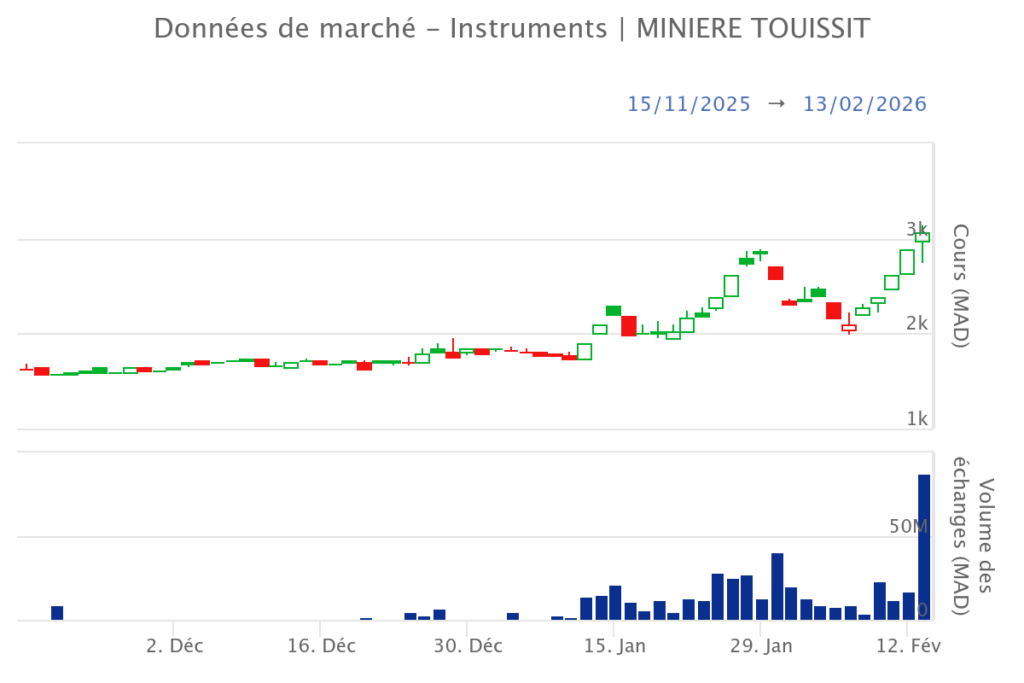 La valeur Minière Touissit (CMT) a marqué l’histoire ce lundi 16 février 2026 à la Bourse de Casablanca en franchissant, pour la première fois, le seuil des 3 365,00 MAD à la clôture. Un nouveau record qui confirme la dynamique exceptionnelle du titre et renforce l’intérêt des investisseurs pour le compartiment minier.