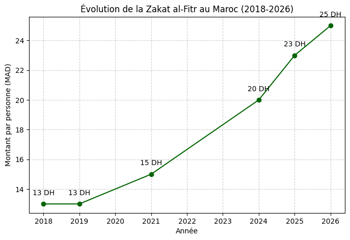 En moins de dix ans, le montant de la Zakat al-Fitr au Maroc a presque doublé, passant de 13 DH par personne en 2018 à 25 DH en 2026. Cette progression d’environ 92 % dépasse largement l’évolution de l’inflation moyenne sur la même période.