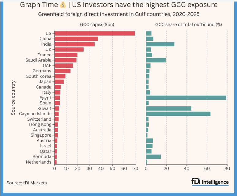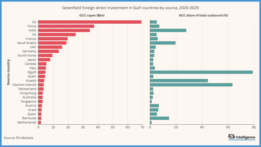 Selon les données de fDi Markets, les entreprises basées aux États-Unis ont engagé près de 70 milliards de dollars d’IDE « greenfield » (nouveaux projets) dans les six pays du Conseil de Coopération du Golfe (CCG) entre 2020 et 2025. À titre de comparaison, la Chine, deuxième source d’investissement, a engagé 32,6 milliards de dollars sur la même période. L’Inde, le Royaume-Uni, l’Arabie Saoudite et la France ont annoncé, chacun, moins de la moitié des investissements prévus par les firmes américaines.